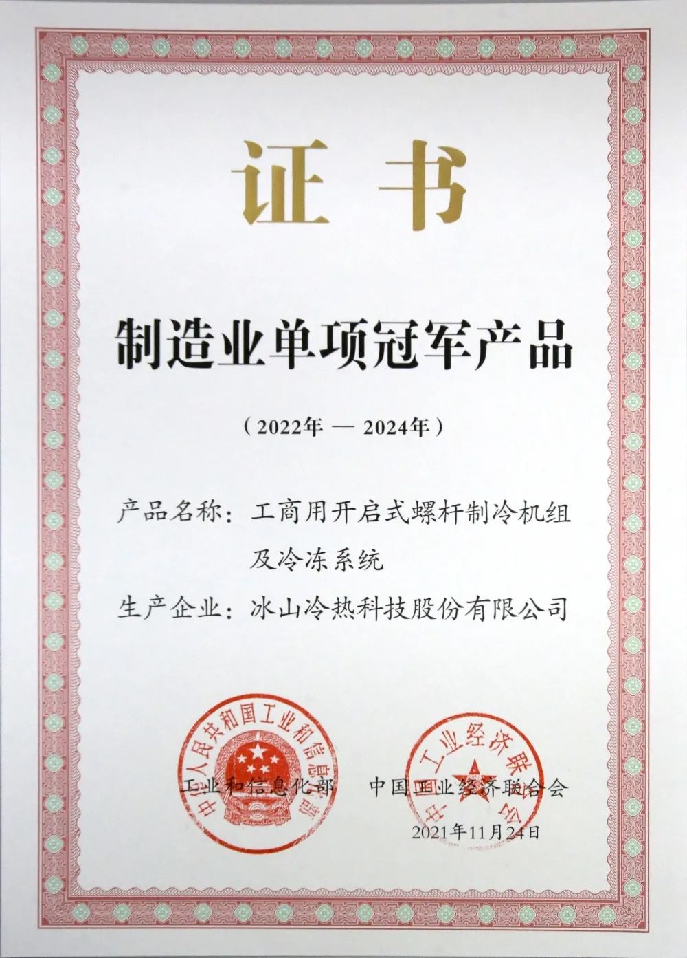 2月8日,大连市工业和信息化局举行制造业单项冠军颁奖仪式,区市县工信系统、国家级及省级制造业单项冠军企业代表参会。会议通报了国家单项冠军和省级单项冠军大连市获奖企业名单,并向17户国家单项冠军企业颁发牌匾、证书及奖金,鼓励支持企业精深发展。冰山冷热科技股份有限公司以“工商用开启式螺杆制冷机组及冷冻系统”获得第六批国家级制造业单项冠军产品的荣誉和奖励,并在会上做了经验交流。