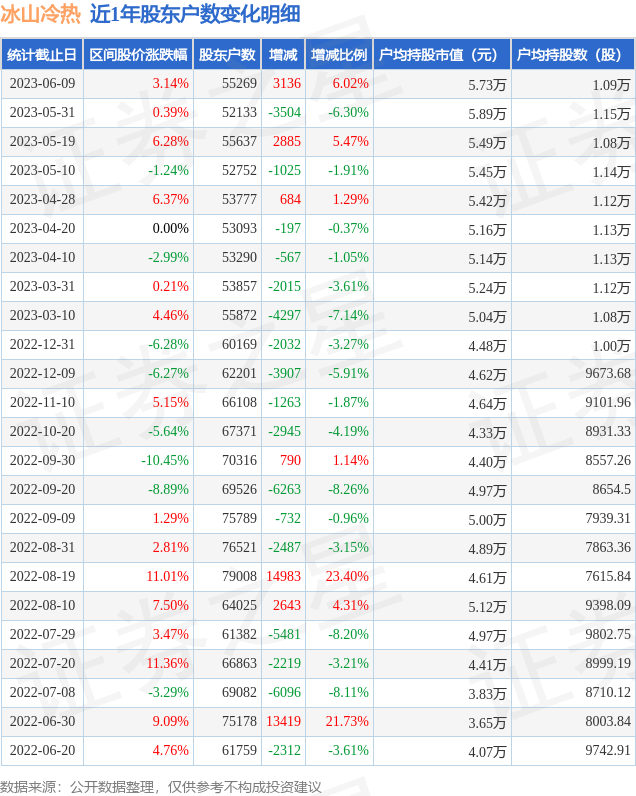 从股价来看,2023年5月31日至2023年6月9日,冰山冷热区间涨幅为3.14%,在此期间股东户数增加3136.0户,增幅为6.02%。