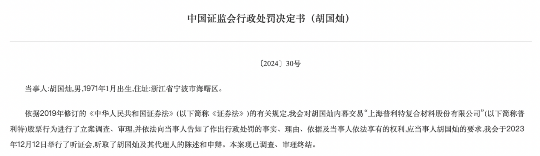 此外,证监会同批更新披露的一则行政处罚决定书同样指向内幕交易。依据2019年修订的《中华人民共和国证券法》的有关规定,证监会对胡国灿内幕交易普利特股票行为进行了立案调查、审理,对胡国灿没收违法所得4378178.58元,并处以13134535.74元罚款。