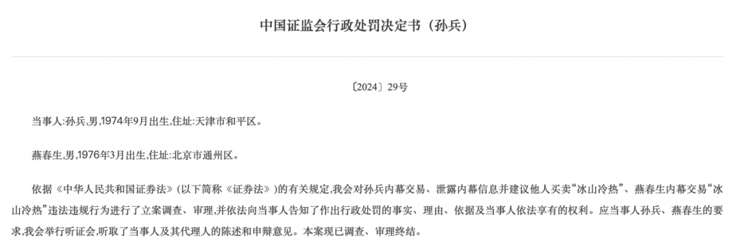其中,证监会对孙兵内幕交易、泄露内幕信息并建议他人买卖“冰山冷热”、燕春生内幕交易“冰山冷热”违法违规行为进行了立案调查、审理,对孙兵责令依法处理非法持有的“冰山冷热”,没收违法所得57401.90元,并处以100万元罚款;对燕春生没收违法所得952771.75元,并处以1905543.50元罚款。