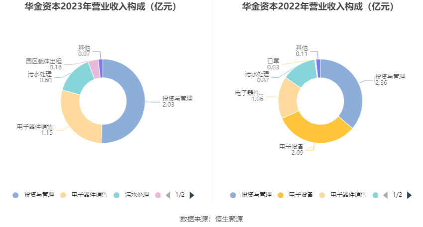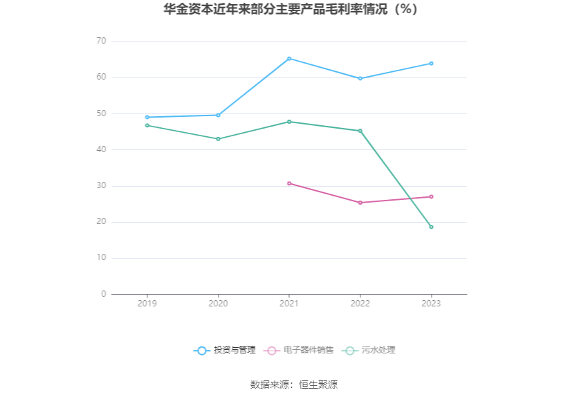分产品看,投资与管理、电子器件销售、污水处理2023年毛利率分别为63.94%、27.01%、18.63%。