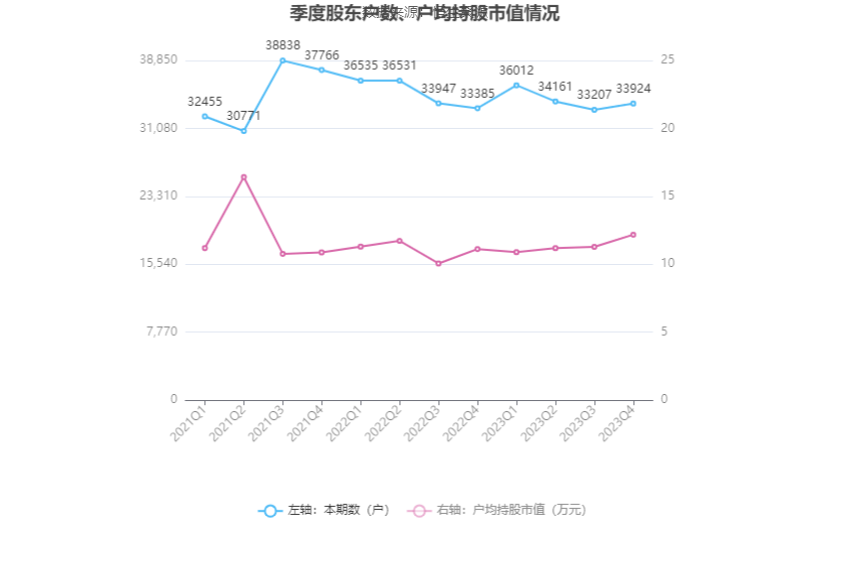 筹码集中度方面,截至2023年年末,公司股东总户数为3.39万户,较三季度末增长了717户,增幅2.16%;户均持股市值由三季度末的11.28万元上升至12.18万元,增幅为7.98%。
