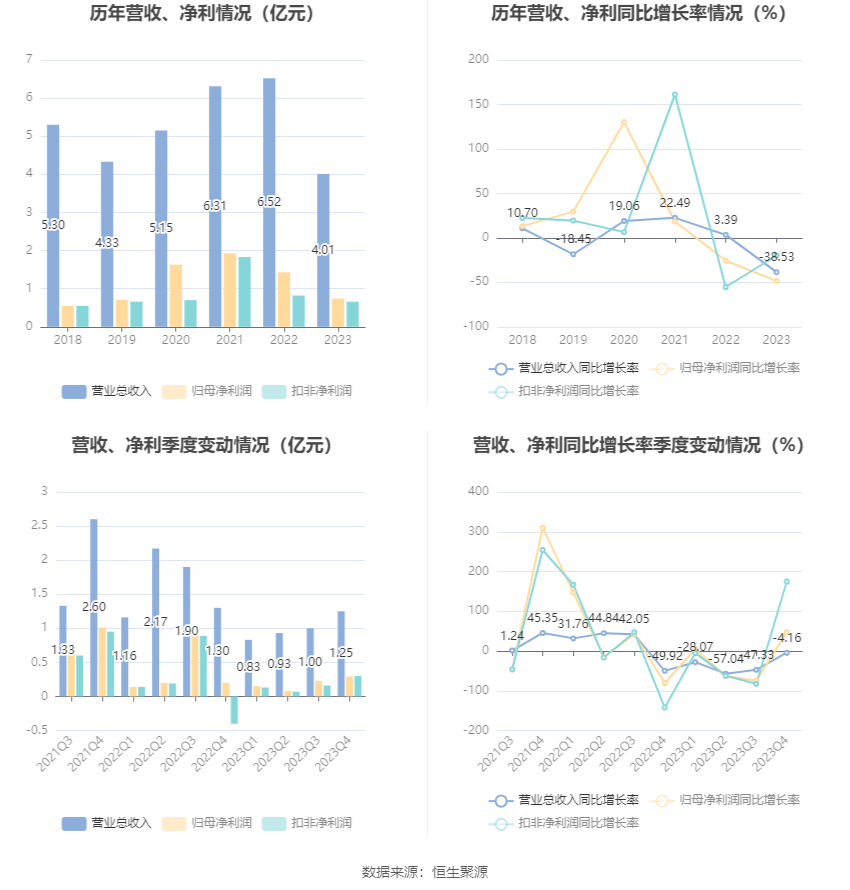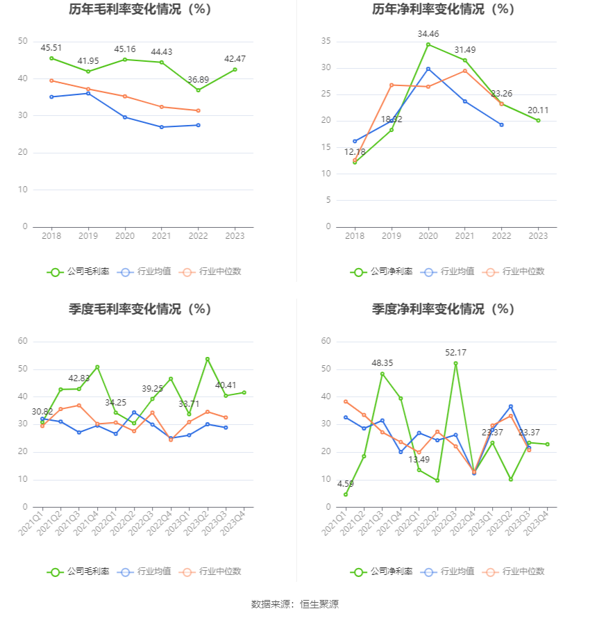 2023年,公司毛利率为42.47%,同比上升5.58个百分点;净利率为20.11%,较上年同期下降3.15个百分点。从单季度指标来看,2023年第四季度公司毛利率为41.55%,同比下降4.99个百分点,环比上升1.14个百分点;净利率为22.84%,较上年同期上升10.35个百分点,较上一季度下降0.53个百分点。