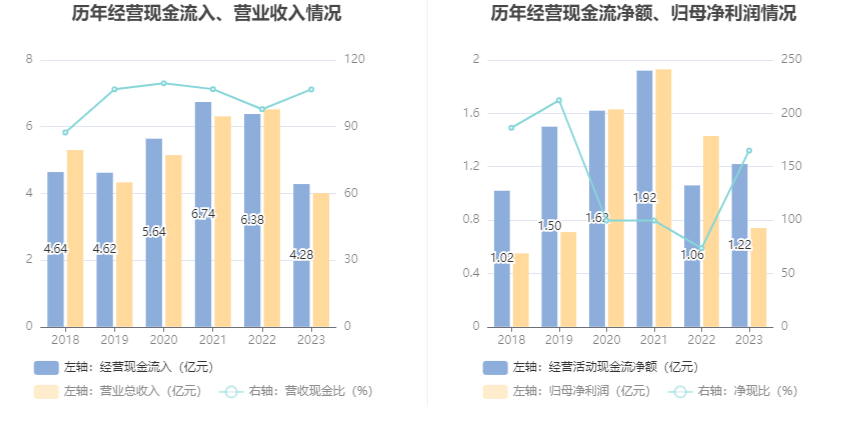 2023年,公司营业收入现金比为106.77%,净现比为165.09%。