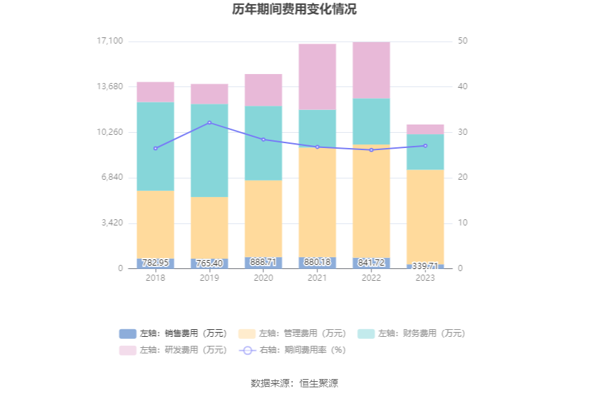 2023年,公司期间费用为1.09亿元,较上年同期减少6197.80万元;但期间费用率为27.08%,较上年同期上升0.93个百分点。其中,销售费用同比下降59.64%,管理费用同比下降16.44%,研发费用同比下降82.7%,财务费用同比下降22.95%。