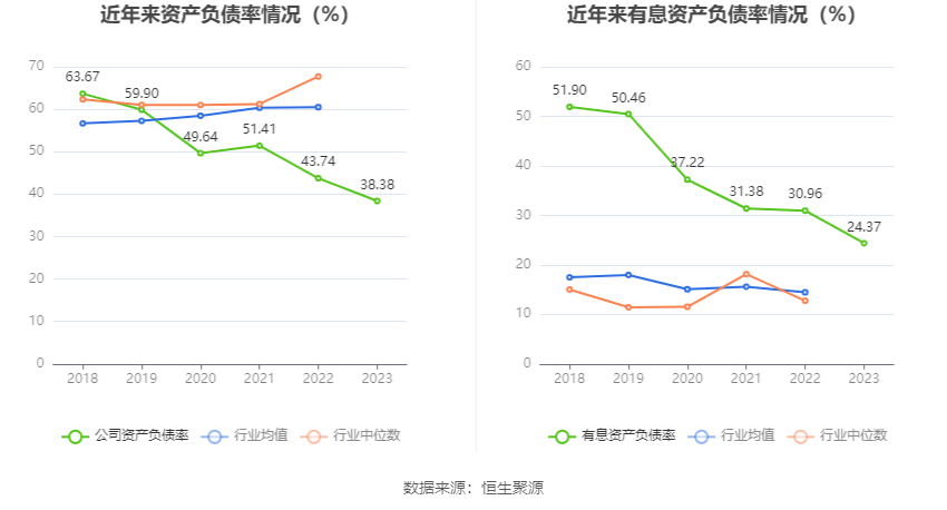 在偿债能力方面,公司2023年年末资产负债率为38.38%,相比上年末下降5.36个百分点;有息资产负债率为24.37%,相比上年末下降6.59个百分点。