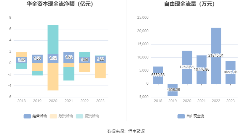 进一步统计发现,2023年公司自由现金流为8657.16万元,相比上年同期下降59.25%。