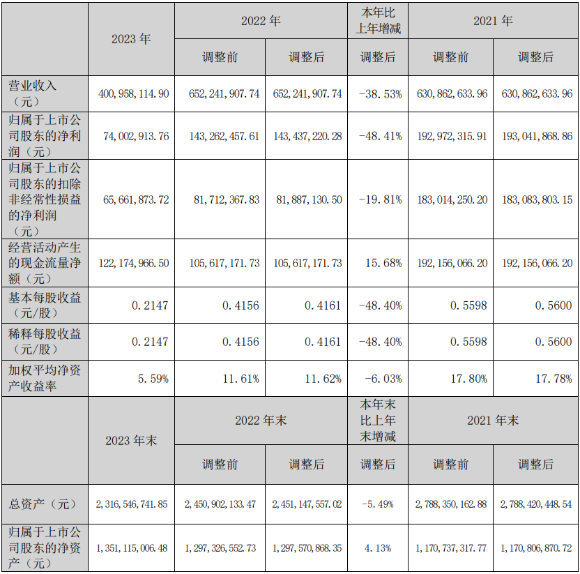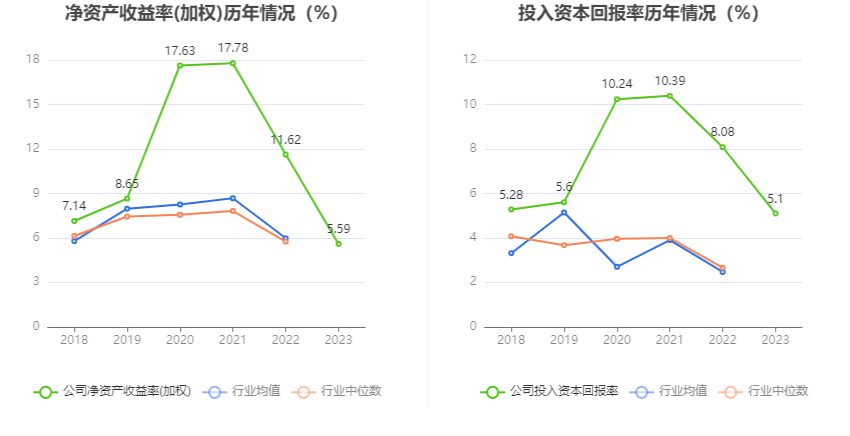 数据显示,2023年公司加权平均净资产收益率为5.59%,较上年同期下降6.03个百分点;公司2023年投入资本回报率为5.10%,较上年同期下降2.98个百分点。