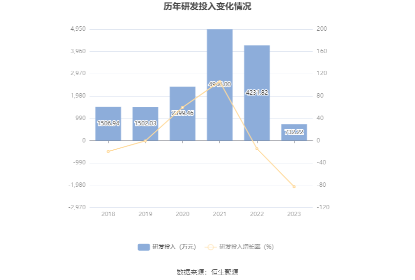 2023年全年,公司研发投入金额为732.22万元,同比下降82.70%;研发投入占营业收入比例为1.83%,相比上年同期下降4.66个百分点。此外,公司全年研发投入资本化率为0。
