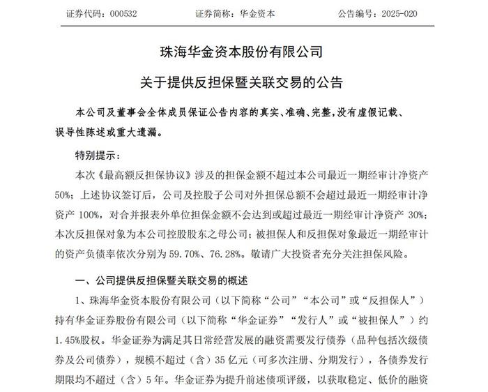 5月26日晚,华金资本(000532)公告称,为支持参股公司华金证券股份有限公司(下称“华金证券”)的融资需求,拟按持股比例向增信方珠海华发集团有限公司(下称“华发集团”)提供最高额不超过5075万元的反担保。此次交易构成关联交易,尚需提交股东大会审议。