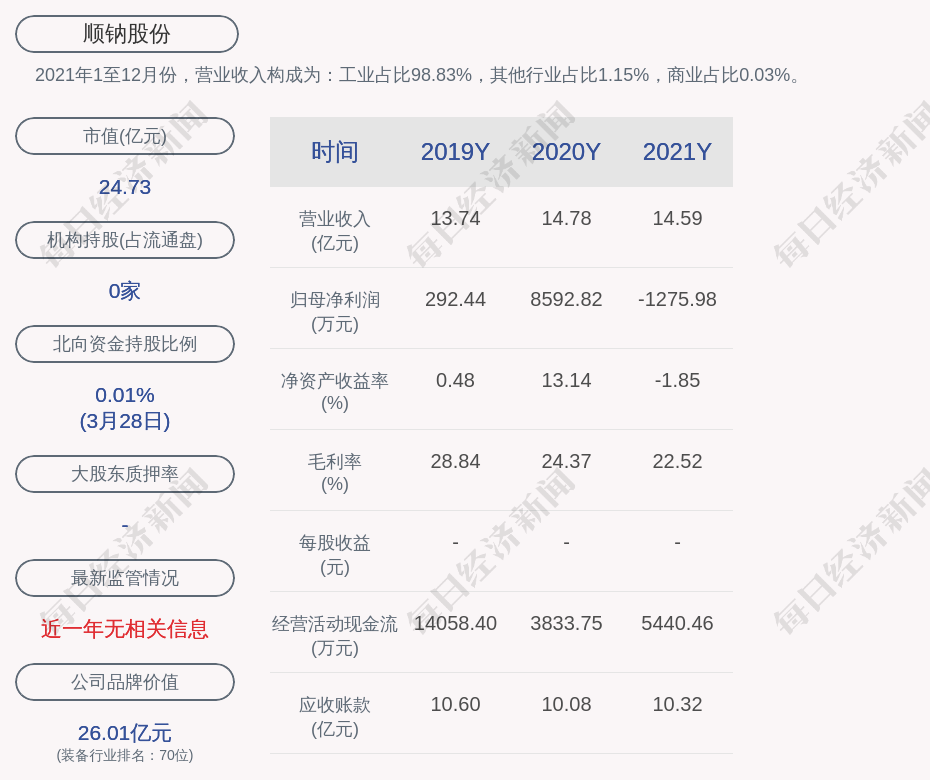 2021年1至12月份,顺钠股份的营业收入构成为:工业占比98.83%,其他行业占比1.15%,商业占比0.03%。