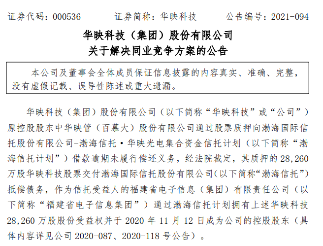 2020 年 11 月,福建省电子信息集团成为华映科技控股股东后,母公司华映科技以及控股子公司福建华冠光电有限公司(以下简称“华冠光电”)从事液晶模组加工业务,控股子公司科立视材料科技有限公司(以下简称“科立视”)从事盖板玻璃业务,前述业务与福建省电子信息集团控制的上市公司合力泰科技股份有限公司(以下简称“合力泰”)存在同业竞争。