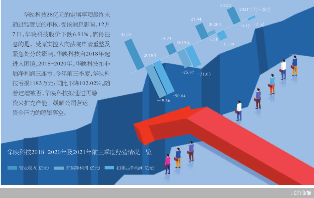 华映科技28亿元的定增事项最终未通过监管层的审核。受该消息影响,12月7日,华映科技股价下跌6.91%。值得注意的是,受原实控人向法院申请重整及紧急处分的影响,华映科技自2018年起进入困境,2018-2020年,华映科技扣非后净利润三连亏,今年前三季度,华映科技亏损1183万元;同比下降102.02%。随着定增被否,华映科技拟通过再融资来扩充产能、缓解公司营运资金压力的愿景落空。