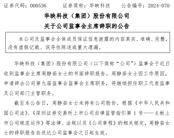华映科技(集团)股份有限公司监事会于近日收到监事会主席周静茹女士的书面辞职报告。周静茹女士因工作原因,申请辞去公司第九届监事会监事会主席职务,将继续担任职工代表监事及公司部门主管职务。