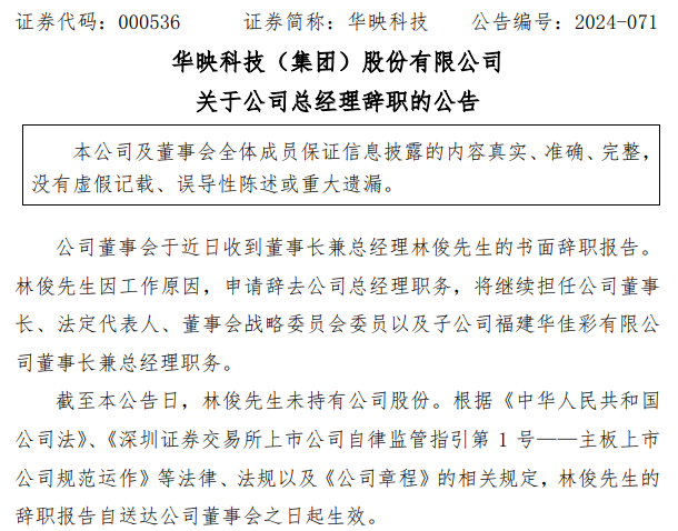 华映科技董事会于近日收到董事长兼总经理林俊先生的书面辞职报告。林俊先生因工作原因,申请辞去公司总经理职务,将继续担任公司董事长、法定代表人及其他职务。