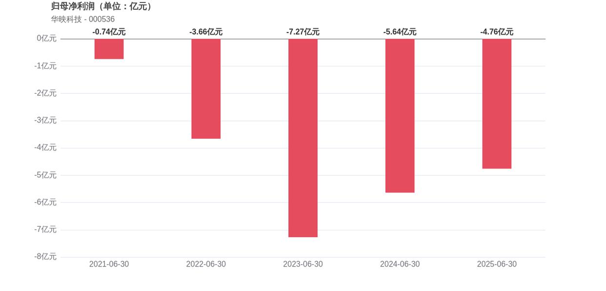 在2025年上半年,华映科技的经营业绩延续下滑态势,营业收入7.21亿元,同比下滑16.59%,归母净利润亏损4.76亿元。引人关注的是华映科技已连续8年中报出现亏损,显示出公司盈利能力持续承压。