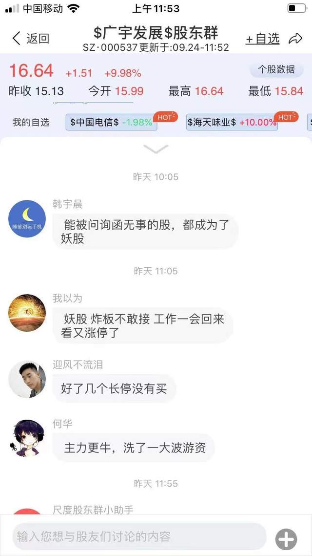 在尺度广宇发展股东群,投资者对广宇发展的走势议论纷纷,有投资者一字涨停开板后追入,目前浮盈超40%,也有的投资者被洗出局。“广宇发展实现连板,一方面重组确实是利好,另一方面整个市场情绪转暖,资金接力意愿强。”