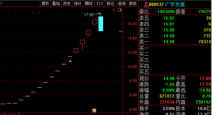 连续13个涨停板,累计涨幅245%,广宇发展(000537.SZ)的爆火,令其投资者纸面财富得到了快速膨胀。但一波涨停输出之后,再送个跌停,投资者就受不了了。