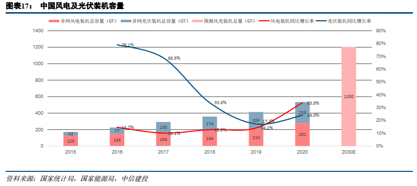 未来十年中国风光发电市场增量空间巨大。在中央对新能源市场发展的统一决策部署下,各主要省份也在各自的“十四五”发展规划中明确了未来5年的新能源发展目标,其中风电和光伏也成为了各省目标中的主要构成部分。中国并网的风电装机总容量从2015年的129GW增长至2020年的281GW,5年间CAGR达16.8%,2020年同比增速达33.8%;并网光伏装机总容量从2015年的43GW增长至2020年的253GW,5年间CAGR达42.5%,2020年同比增速达24.0%;根据习近平总书记代表中国做出的承诺,2030年风电与光伏装机总容量将达到1200GW,相比2020年末的水平还有124.7%的提升空间,据此预计风光发电未来10年的复合年均增速将达8.4%,整个风光发电市场将在近些年迎来巨大的增量。