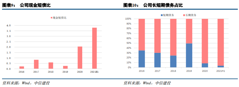 财务承压,面临较大债务压力。在公司销售规模收缩的同时,公司有息负债反而逆势上涨,截至2021年6月30日,公司有息负债375亿元,是2016年年末的4.1倍。三道红线情况来看,2016年至今,公司扣除预收款的资产负债率始终保持在130%以上,并未得到改善,2021年6月30日为132%,与去年年末持平。净负债率方面,2016年达249%,2017年资产重组后由于净资产增加而下降至142%,但是至2020年起再次大幅增加达到181%,2021年6月30日为193%。现金短债比方面,2016至2019年始终不足1倍,2020年达2.05倍,2021年上半年达3.79倍,主要来自于负债结构的改善,2019年短债占比49%,但是2020年降至8%,2021年上半年再次下降至4%。尽管负债结构有所改善,但公司整体债务呈上升趋势,面临着较大压力。