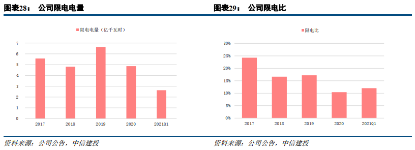 政策支持及输送条件改善双重利好下,限电问题得到优化。2020年公司限电电量4.86亿千瓦时,同比下降26.8%,主要由政策对改善限电问题的支持,宁夏盐池项目解决输送问题后实现全容量项目,以及新疆地区外送通道条件改善三重因素所致。2021年一季度公司限电比较往期略微提升至12.0%,主要由于全国一季度并网风电装机量大增,且来风情况良好,但是部分场站外送能力有限导致。