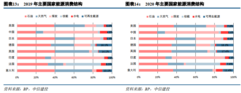 中国的可再生能源消费占比较低,未来有较大提升空间。根据BP中国的统计,2019年中国对可再生能源的消费量占比仅为4.8%,在GDP排名前八的国家中仅高于印度,落后于其他发达国家;2020年,中国对可再生能源的消费量占比提升至5.4%,仍然落后于其他的发达国家,占比最高的两个国家德国和英国,2020年的该项占比分别达到18.2%和17.4%;且从占比的变动上来看,德国在2019-2020年提升了2.1个百分点,英国则提升了3.3个百分点,相比之下,中国和印度只分别提升了0.6个百分点。中国对可再生能源、核能、水电的消费量占比,在2020年达到15.7%,距离“十四五”规划中规划的2025年达到20%左右的水平,仍有较大差距。在“双碳”目标的指引下,中国的新能源市场在未来较长的一段时间内具有广阔的发展空间,而占据非水电新能源发电主力的风电和光伏,也将极大受益于这一增长进程。