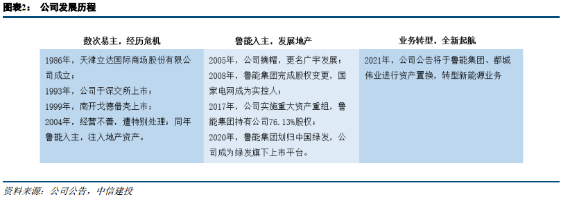 公司历经数次重组,2021年公告将转型新能源业务。公司前身为天津立达国际商场股份有限公司,成立于1986年,1993年于深交所上市。1999年,南开戈德借壳津国商上市,由于经营不善,2004年遭特别处理,同年,鲁能集团旗下南开生化经司法拍卖获得公司25.29%股权,成为公司第一大股东。鲁能入主后向上市公司注入房地产资产重庆鲁能,于2004年实现盈利,2005年摘帽并更名为广宇发展。2008年,鲁能集团完成股权变更,山东省电力集团占股100%,国家电网为实际控制人。2017年,公司实施重大资产重组,通过发行股份向鲁能集团购买6家公司股权,重组完成后鲁能集团持有公司76.13%股权。2020年,国家电网将其持有的鲁能集团100%股权划转至中国绿发,公司成为中国绿发旗下上市平台。2021年9月,公司公告将与鲁能集团、都城伟业进行资产置换,置换完成后将剥离全部的房地产业务,转型至新能源领域。