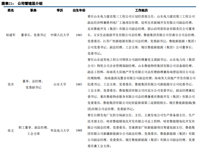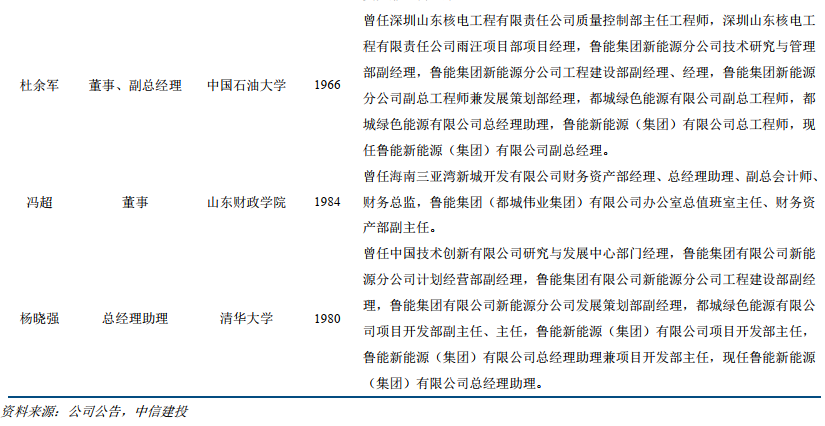 鲁能新能源管理层行业经验与管理经验丰富,同时本次置换不涉及员工安置问题,架构稳定。现任公司董事长粘建军及总经理范杰、总工程师杨晓强等管理人员均曾在鲁能集团及其下属新能源公司任职,拥有丰富的新能源行业实践经验与资源积累,有助于公司业务的稳步扎实推进。此外,资产置换不涉及员工安置,公司原下属企业的员工,仍由该等下属企业履行与其员工的劳动合同。