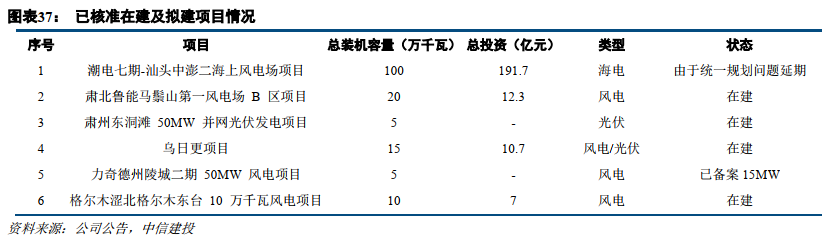 储备项目丰富,目前已核准在建拟建项目装机容量共155万千瓦。截至2021年8月,公司共有6个在建及拟建的项目(已核准),装机容量合计155万千瓦。其中潮电七期-汕头中澎二海上风电场项目总投资近200亿,规划装机容量100万千万,已获得政府核准,但由于国家统一规划问题,目前暂不具备开工条件。其余5个项目目前皆在建设当中。