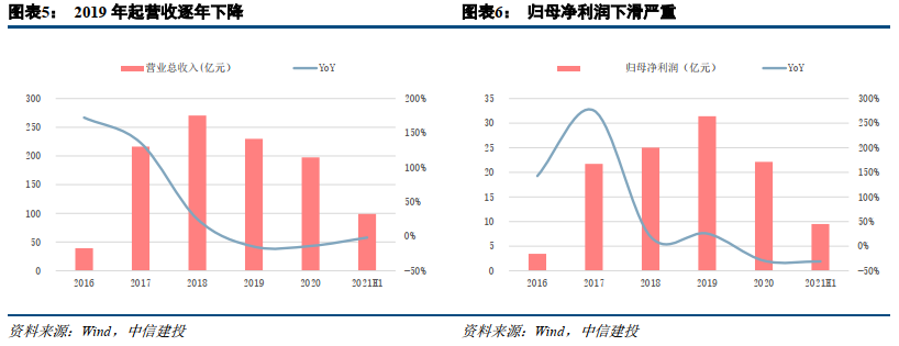 销售疲软之下,业绩连年下滑。自2017年资产重组实现业绩大幅增长之后,2019年开始,公司营收出现下滑,当年录得229.9亿元,当年同比下降15%,2020年再次下降14%至197.5亿元,2021年上半年降幅收窄至2%,录得99.0亿元。相伴随的是盈利能力更大幅度的衰退,在行业整体盈利能力下降的同时,广宇也难以独善其身,2020年其归母净利润同比下滑30%至22.1亿元,2021年上半年同比下滑31%至9.5亿元。