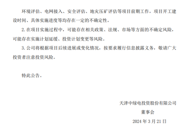 根据公告,天津中绿电投资股份有限公司所属子公司青海茫崖鲁能新能源有限公司于近日收到青海海西州能源局出具的《关于同意青海茫崖鲁能新能源有限公司青海省2023年风电项目2标段海西州50万千瓦风电项目核准的通知》,同意该项目核准,要求青海茫崖鲁能新能源有限公司尽快办理各项前期手续,确保项目合法合规开工建设。