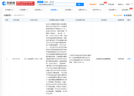 天眼查App显示,近日,云南白药集团股份有限公司新增一则行政处罚,处罚事由为生产、销售不符合经注册产品技术要求的一次性使用医用口罩,处罚结果为没收不合规医用口罩35095只,并罚款110299.15元。处罚单位为云南省药品监督管理局。