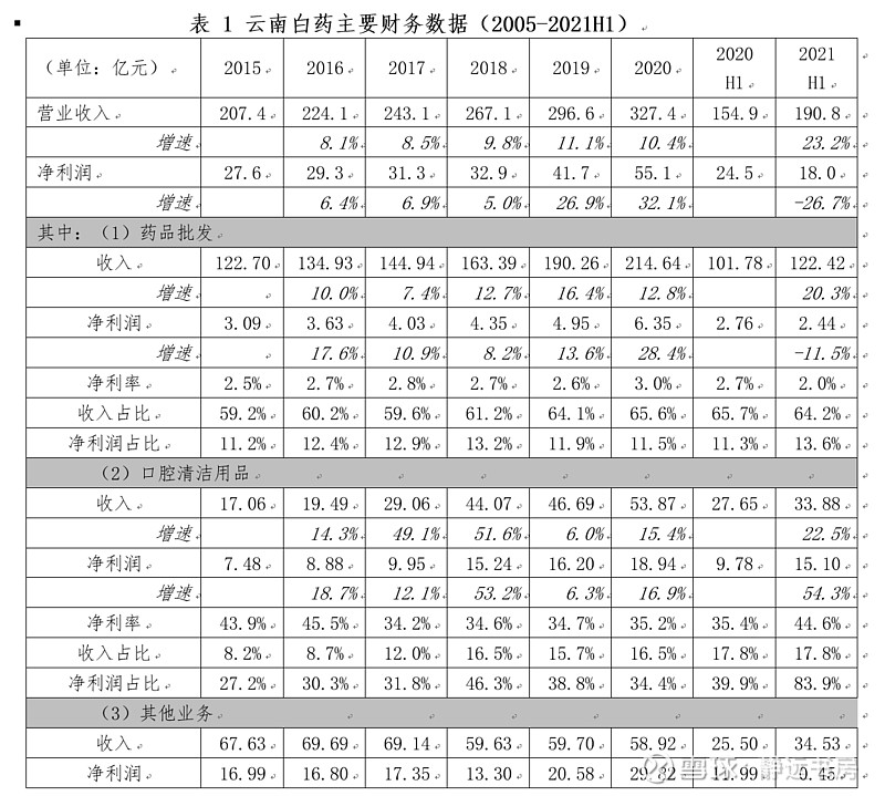 鉴于公司的年报和半年报披露情况,只能看到以云南白药牙膏为主的口腔清洁用品的收入和净利润情况(见表1),口腔清洁用品业务已成为公司净利润的最大来源。