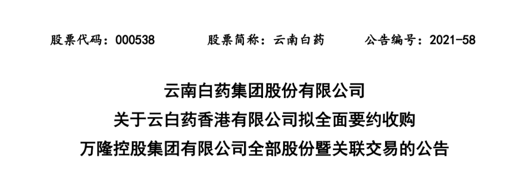 11月3日,云南白药发布《关于云白药香港有限公司拟全面要约收购万隆控股集团有限公司全部股份暨关联交易》的公告。