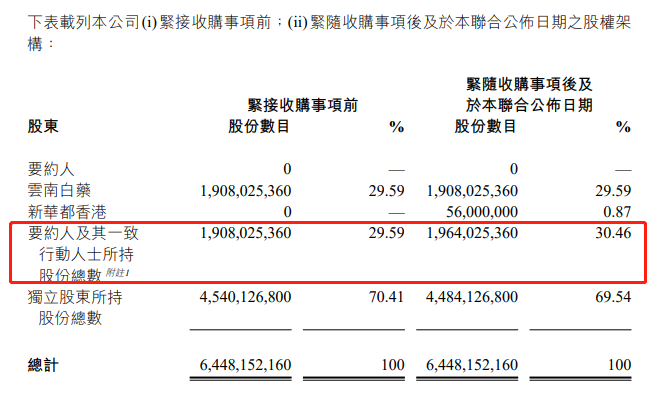 陈发树为云南白药(000538.SZ)的董事,并连同其一致行动人士持有云南白药约25.04%权益。要约人为云南白药之间接全资附属公司。因此,要约人云白药香港、陈发树、新华都香港、厦门新华都、新华都实业及云南白药根据收购守则被推定为一致行动人士。