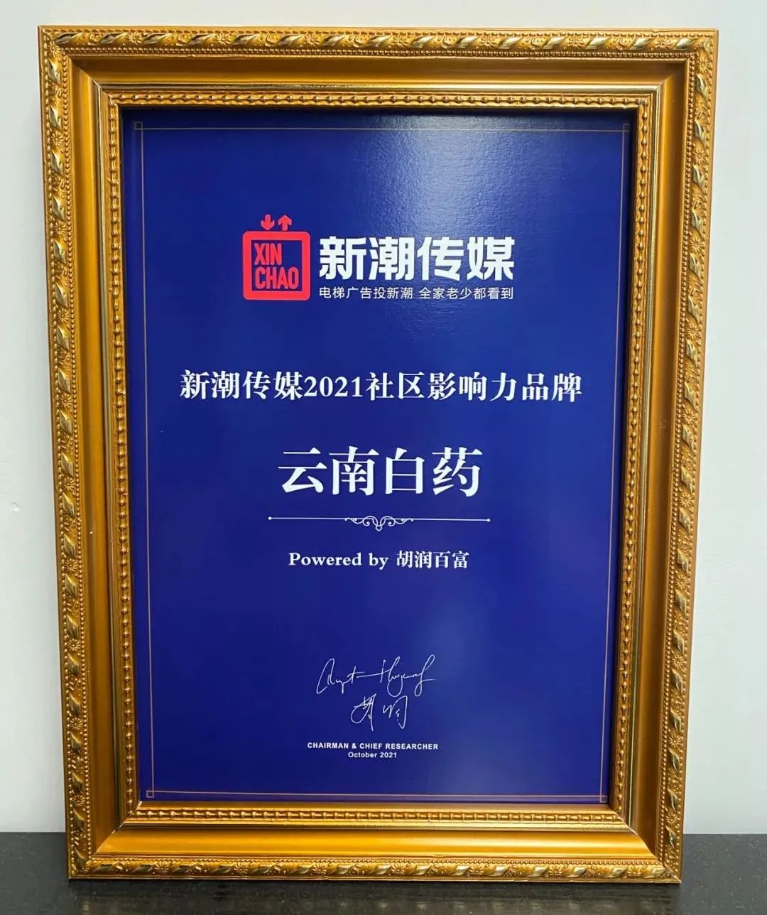 今年10月,胡润研究院联合新潮传媒发布《2021胡润品牌价值榜》,云南白药以280亿的品牌价值成为最具价值医疗健康品牌TOP2。同时,在中国新潮品牌大会上,云南白药荣获《新潮传媒2021社区影响力品牌》,彰显品牌实力。