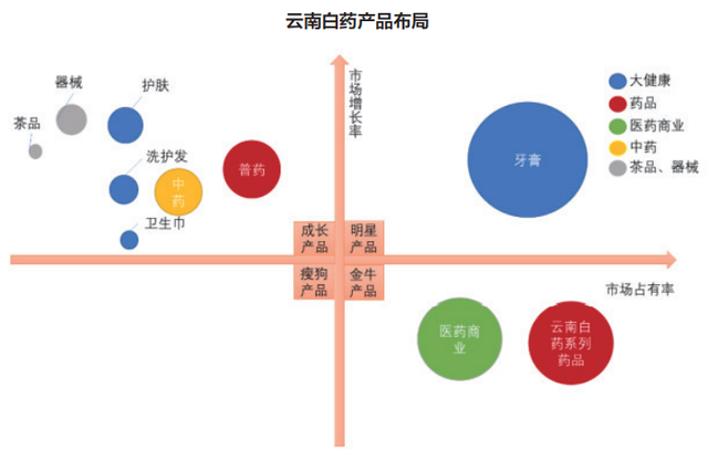 云南白药牙膏提供了一条可供参考的品牌延伸模式,企业在涵盖药品、健康品、医药商业和中药资源的四大业务板块基础上继续扩大版图,为云南白药品牌延伸持续赋能。牙膏作为公司的明星产品,具有高市占率和高增长率的特点,产品不断开拓创新,仍然具有较高增长潜力。药品和医药商业属于公司的金牛产品,为公司贡献稳定的利润和现金流来源,具有较高的市场份额,同时奠定白药的品牌基础,为孵化其他系列产品提供支持。公司的成长性产品品类丰富,主要包括中药、洗护发用品、卫生巾、护肤品等,这类产品目前市占率较低,但具有较高的业绩弹性增长,未来发展的空间大。