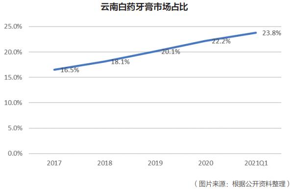 云南白药牙膏在市场中获得的成就,实现了企业从中医药向大健康领域的成功跨界转型,成为大健康板块的标杆,企业自此逐步涉猎口腔护理、护肤、洗护发、卫生巾等多个领域。云南白药牙膏2009年销售额突破7亿,2015年超过20亿,2020年超过51亿,牙膏收入贡献在大健康板块收入占比高达95%。云南白药牙膏从2019年至今稳居中国市场份额第一,2020年末市场占有率达到22.2%,2021年一季度末,市场占有率进一步攀升至23.8%,2021上半年同比增长1.4%,与其他主要竞品持续拉开差距,进一步稳固领先地位。