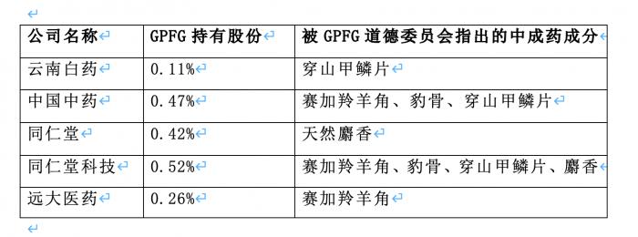 基于今年3月15日至4月28日期间,GPFG道德委员会向挪威央行提出的建议,GPFG道德委员会单方面认为,五家中国中药公司在生产或销售的中药成分中,使用了濒危物种的身体部位,尤其是损害了“生物多样性”(biodiversity),对环境造成了严重,而且存在不可接受的风险(原文表述为“an unacceptable risk of the company contributing to severe environmental damage”)。