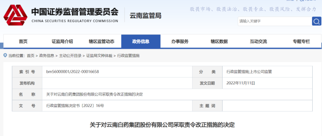 11月11日,云南证监局公布《关于对云南白药集团股份有限公司采取责令改正措施的决定》。云南证监局调查发现云南白药(000538)公司治理不规范、内部控制不完善、财务核算不规范,决定对云南白药采取责令改正的监督管理措施。