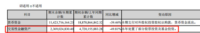 早在去年三季度末,该公司的交易性金融资产大幅降低至23.69亿元,公告解释称,“本年处置了部分股票投资及基金投资”。