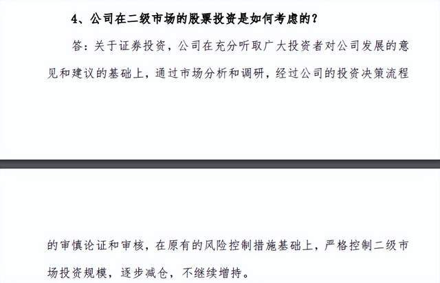 今年2月14日,在一场调研活动中,有机构人士提问道,“公司在二级市场的股票投资是如何考虑的?”