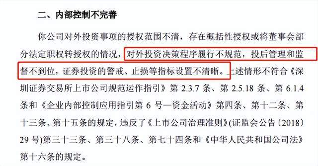 存在的问题包括公司治理不规范、内部控制不完善、财务核算不规范。其中,监管部门提到了“证券投资的警戒、止损等指标设置不清晰”。