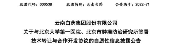 9月2日,云南白药发布公告,与北京大学第一医院(北大医院)、北京市肿瘤防治研究所(北肿研究所)签订《技术转让与合作开发协议》,北大医院、北肿研究所将其合作研发的前列腺特异性膜抗原(PSMA)靶向核药相关专利转让给云南白药。