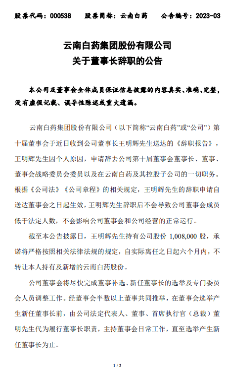 3月6日晚间,云南白药发布公告称,近日收到公司董事长王明辉送达的《辞职报告》,王明辉因个人原因,申请辞去该公司第十届董事会董事长、董事、董事会战略委员会委员以及在云南白药及其控股子公司的一切职务。
