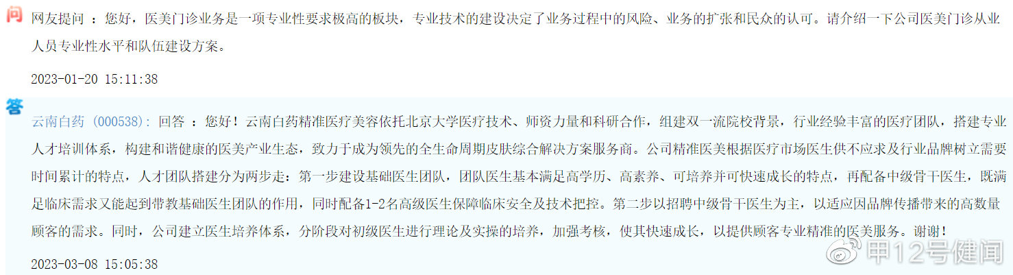 其中一个方向就是医美产业。2021年上半年,云南白药在昆明开设“云南白药精准定制肌肤管理中心”;2022年,云南白药在投资者互动平台上透露,计划于2022年12月前在北京、上海开设8家医美医疗门诊部机构。