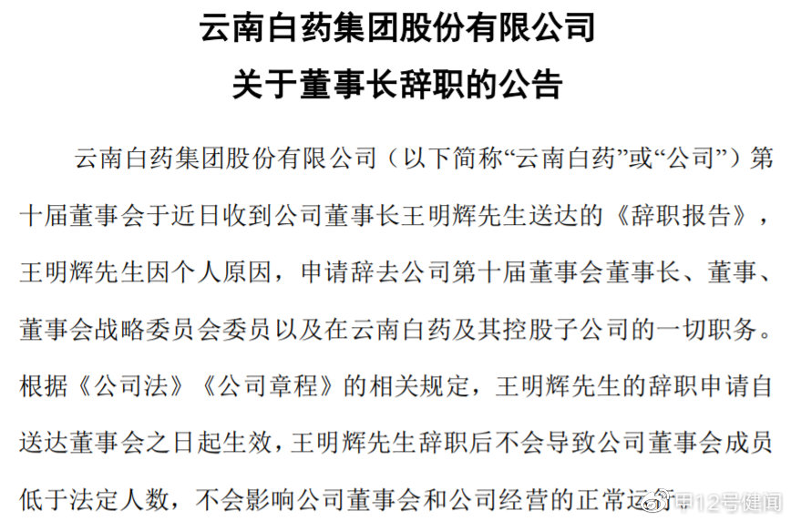 云南白药公告显示,公司第十届董事会于近日收到董事长王明辉送达的《辞职报告》,王明辉因个人原因,申请辞去公司第十届董事会董事长、董事、董事会战略委员会委员以及在云南白药及其控股子公司的一切职务。