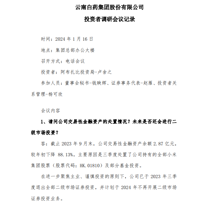 近日,云南白药(000538.SZ)发布的投资者调研会议记录显示,截至2023年9月末,云南白药交易性金融资产余额2.87亿元(人民币,下同,约5400万新元),较年初下降88.13%,主要原因是三季度处置了公司持有的全部小米集团及部分基金投资。云南白药表明,在进一步聚焦主业、谨慎投资的原则下,公司已于2023年三季度退出全部二级市场证券投资,2024年不再开展二级市场证券投资业务。