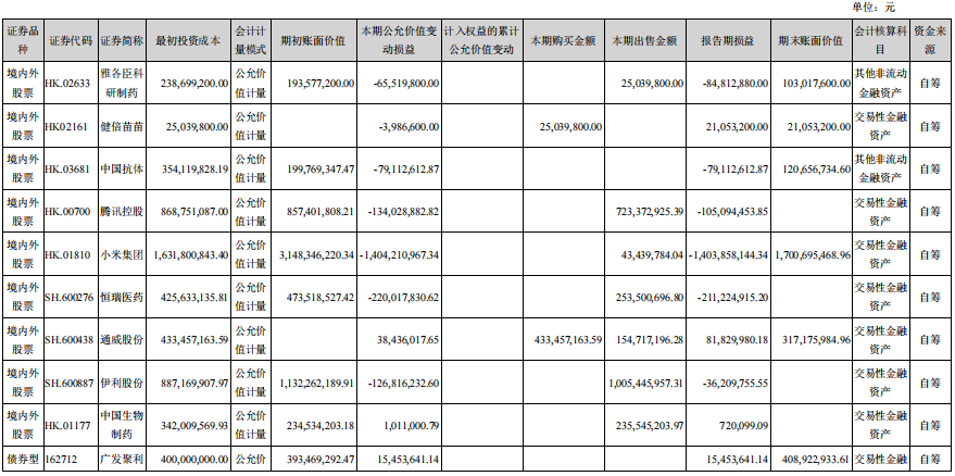 47亿元“交易性金融资产”具体包括哪些资产呢?财报中也有详细披露,包括公司所持有的每一支股票或债券的名称、金额、盈利/亏损、减持/增持的情况(如下表)。以其持仓第一的股票小米集团(HK.01810)为例:2021年末持有的小米市值共17.01亿元,而2021年初的时候持有小米的市值是31.48亿元,在这一支股票上2021年亏损就达到了14.04亿元。