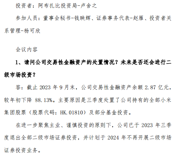 1月17日,云南白药批露的投资者调研会议记录显示:公司已于 2023 年三季度退出全部二级市场证券投资,并计划于 2024 年不再开展二级市场证券投资业务。